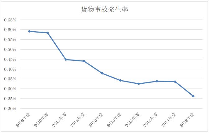 同社が17日に公表した年度累計事故率によると、最近の貨物事故率に大きな変動はなく、2013年度以降は0.3%から0.35%の間で上下を繰り返す動きとなっていたが、18年度は19年2月までの事故率が0.262%と、17年度の0.336%から22.1%の減少を記録した。