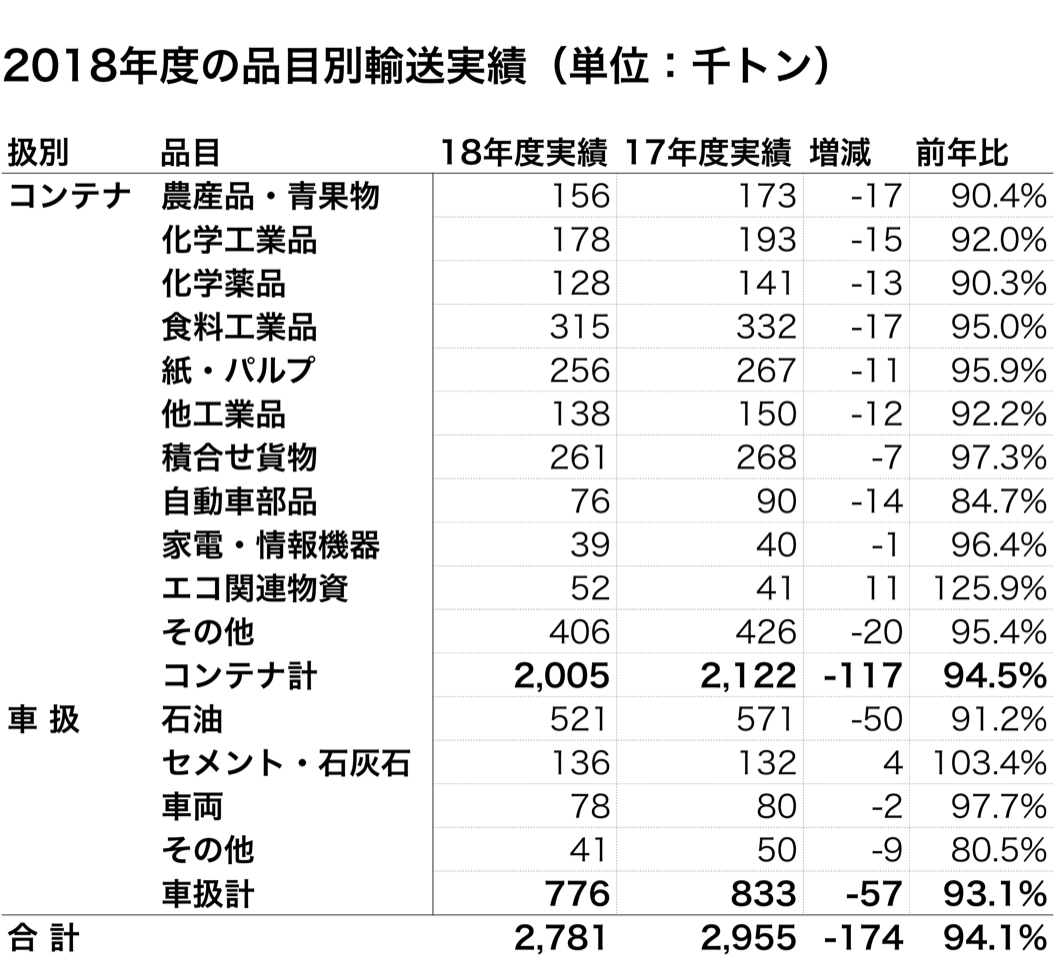 ロジスティクス日本貨物鉄道(JR貨物)が17日に発表した2018年度の輸送実績(速報値)によると、上期に相次いで発生した大阪府北部地震、西日本豪雨、台風20・21・24号の接近、北海道胆振東部地震などの影響を大きく受け、特にコンテナ輸送量は17年度実績を1割近く下回り2027.3万トンにとどまった。