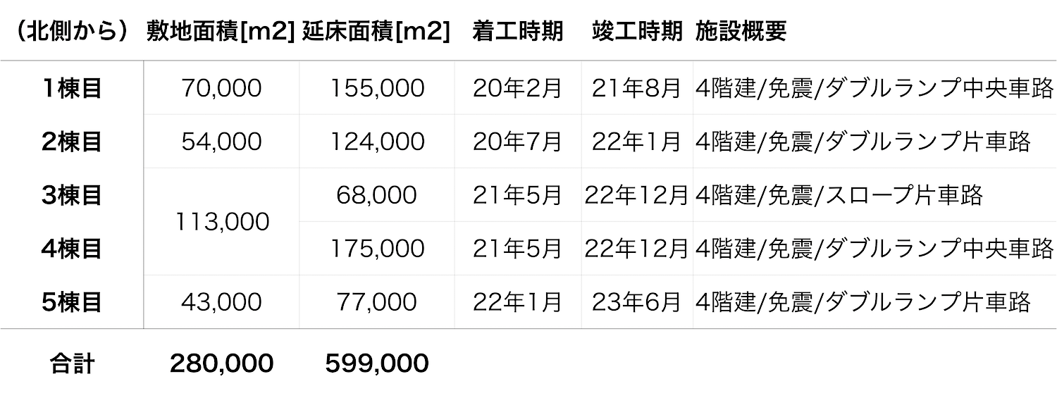 建築工事は北側から順に、2020年2月から22年1月にかけて段階的に着手。21年8月から23年6月にかけて完成した後は5棟の総延床面積が60万平方メートルの、川沿いに一列に並ぶ物流施設群を形成する。建物ごとの延床面積は、北側から15.5万、12.4万、6.8万、17.5万、7.7万平方メートル。