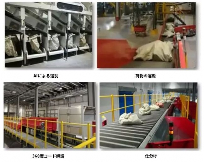 このシステムは、レーザースキャン・画像識別装置では識別できなかった荷物の自動仕分けを可能にするもので、AIや360度コード解読技術などを組み合わせ、1袋につき0.9秒で識別。99.99%の識別能力で高い仕分け精度を実現する。