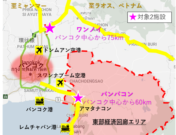 1施設目「バンパコン」はバンコク東部3県の経済特区「東部経済回廊」内に位置し、バンコク東部、バンナー高速道路出入口に近接した立地。バンコク市内、スワンナプーム空港、レムチャバン港へアクセスしやすい。2施設目「ワンノイ」はバンコク北部、バンコク市内とベトナム、ラオス、ミャンマーを結ぶ結節点に立地。周辺には大規模工業団地や総合卸売問屋が多数存在し、日系製造企業が集積している。