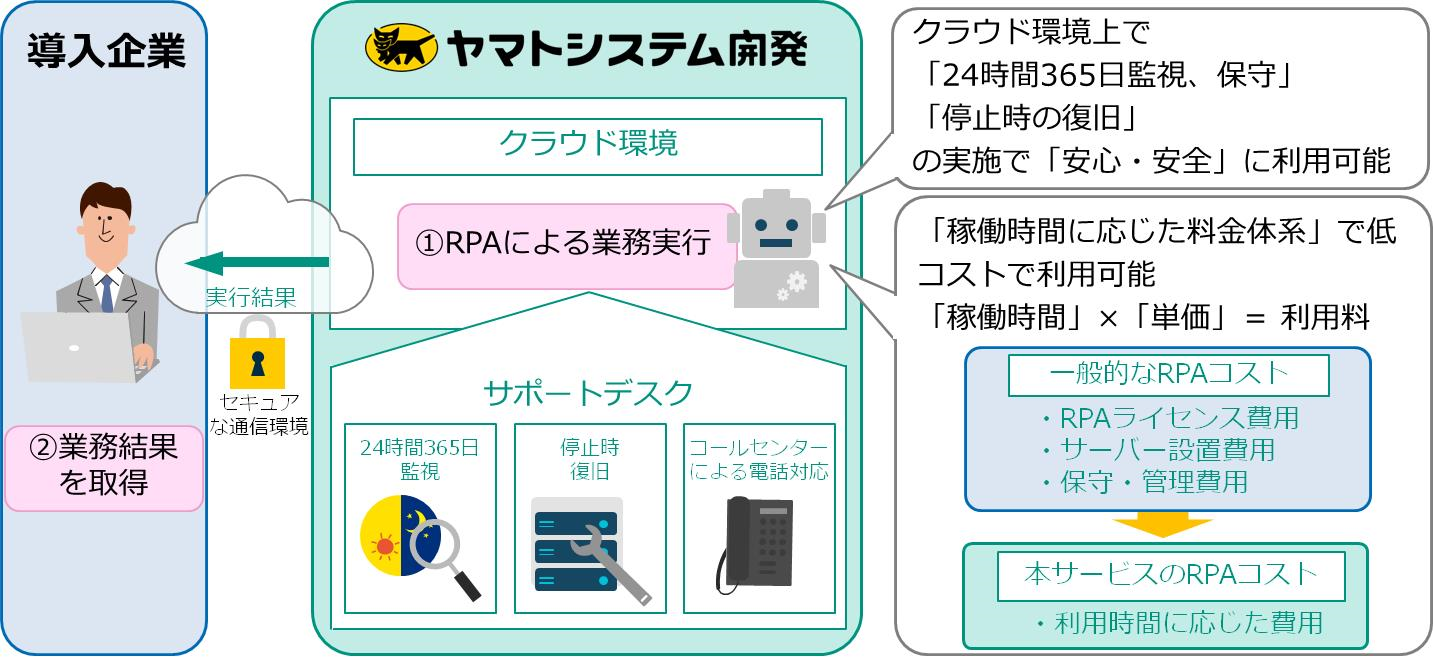 サービス・商品ヤマトホールディングス傘下のヤマトシステム開発は7日、ロボットを使った業務の自動化(RPA)に取り組む企業に対し、24時間365日の監視・保守・復旧を稼働時間に応じた料金体系でサポートするクラウドサービスを提供すると発表した。
