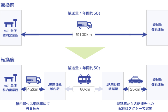 「幌延駅→稚内駅間」では空になった専用ボックスを幌延町の配送委託事業者が幌延駅から稚内駅に向かう列車の車内に積み込み、稚内駅で佐川急便稚内営業所のセールスドライバーが専用ボックスを列車内から降ろし、営業所に持ち帰る。