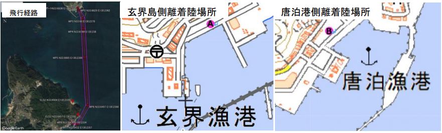 ドローンは海上から60メートルの高度を飛行し、玄界島と唐泊港を往復。海上で補助者なしの目視外飛行を行うのは国内初の事例となる。