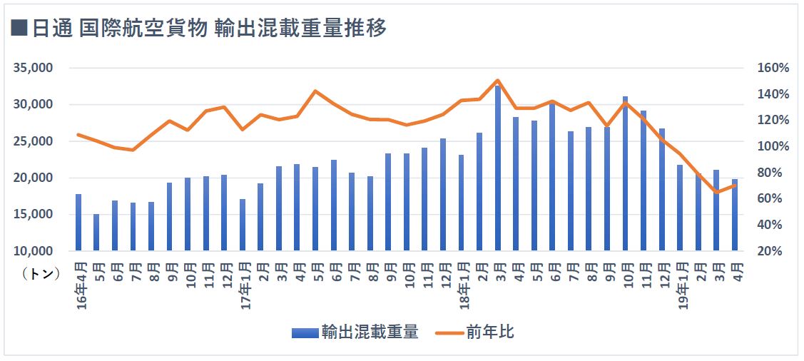 日通・航空貨物輸出、再び前年比4割減 19/09/12