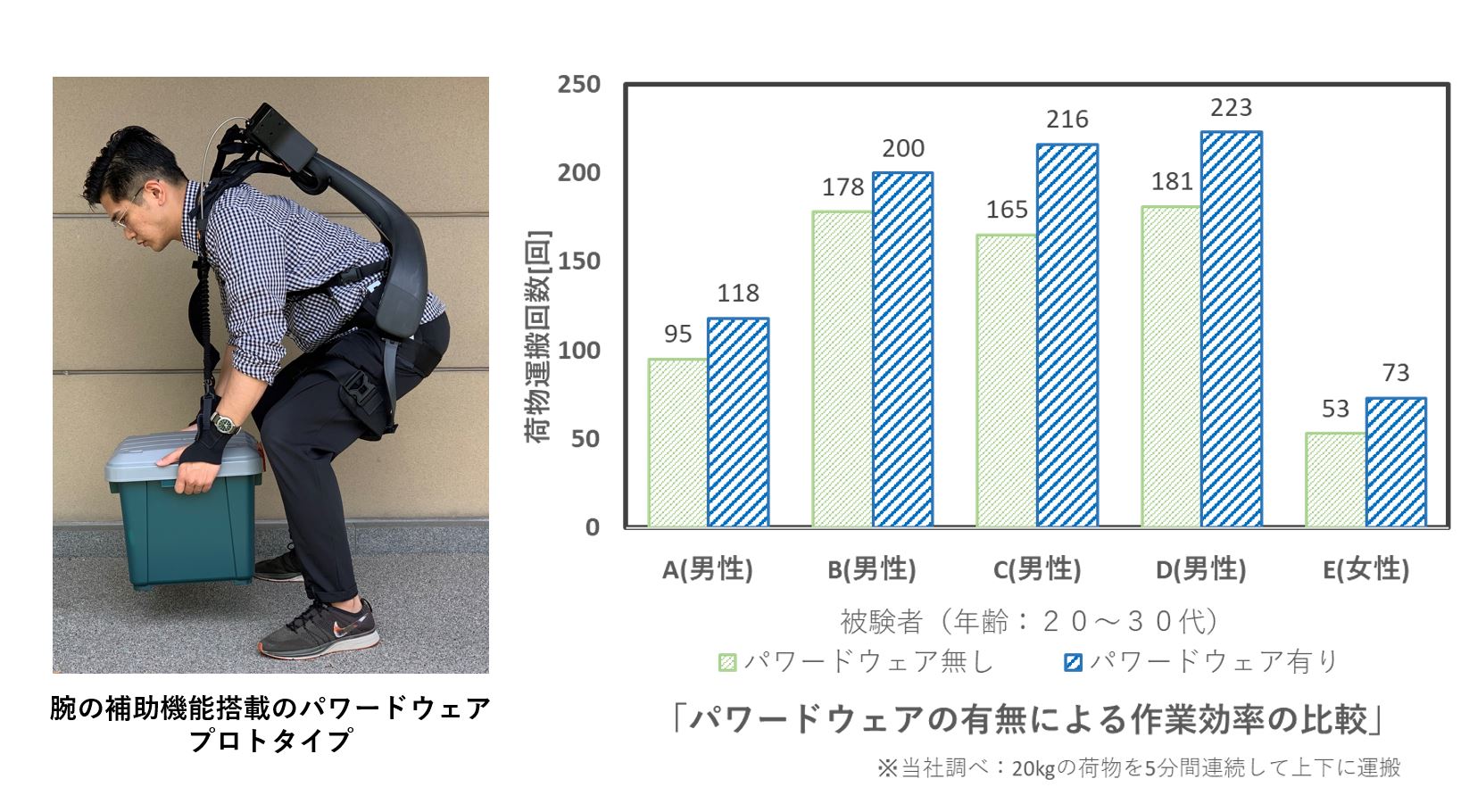 実験機となるプロトタイプは、販売中の腰用パワードウェア「ATOUN MODELY」(アトゥンモデリー)に腕補助用のユニットを取り付けたもので、従来の腰の補助に腕の補助機能が加わることで作業効果が最大37.7%向上するという。