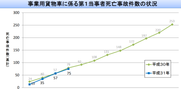 大型トラックが12件(2件増)、中型が4件(同水準)、準中型2件(4件減)、普通0件(2件減)となった。なお、1月から4月までの累計死亡事故件数は75件であった。