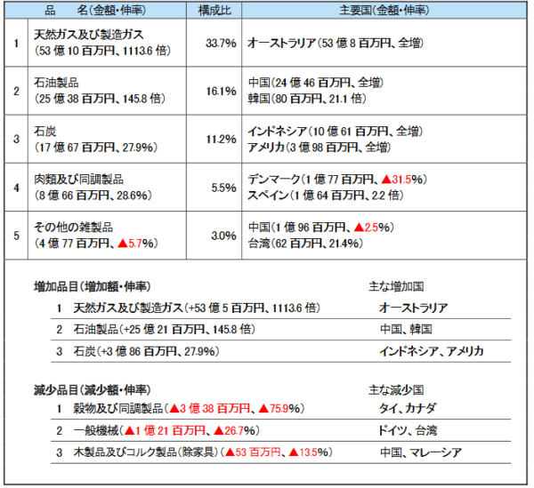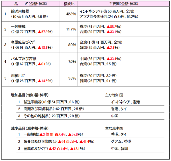 調査・データ沖縄地区税関は22日、4月の管内貿易概況(速報値)を公表した。輸出入の収支は133億8600万円の輸入超過。輸出が2か月ぶりの増加となる23億7700万円(25.7%増)で、輸入は5か月ぶりの増加となる157億6300万円で2.1倍に増えた。主要品目別の動向は次の通り。