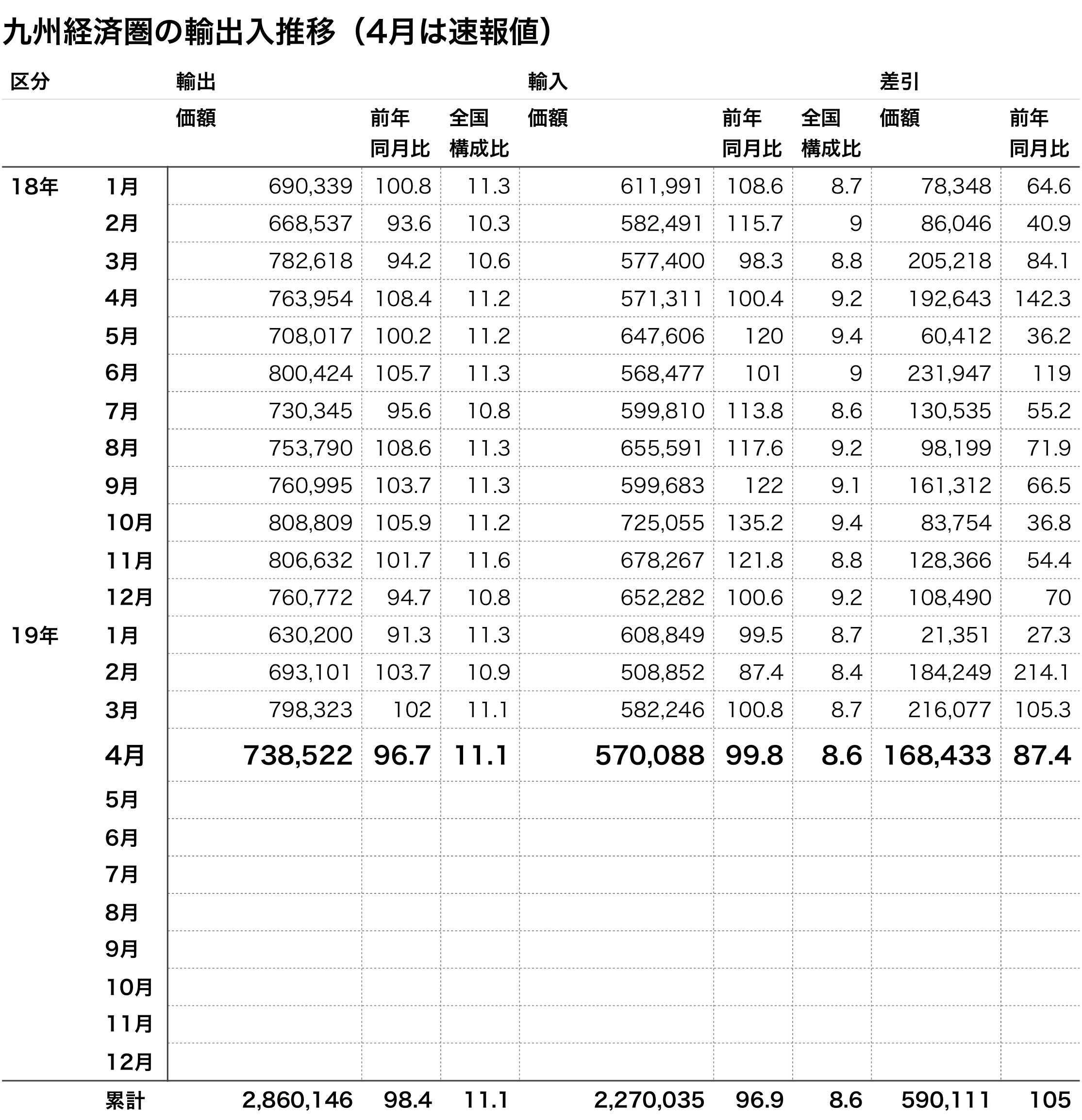 国内門司税関が22日に発表した4月の九州経済圏(九州全県、沖縄県、山口県)の貿易速報によると、輸出入の収支差額は1684億円(前年同月比12.6%減)の黒字となった。輸入が0.2%減の5701億円と前年同月並みだったのに対し、輸出が3.3%少ない7385億円にとどまったことが黒字縮小につながった。