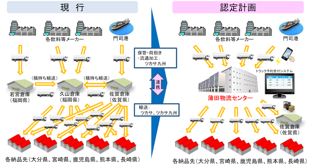 この計画により、ツカサ九州はトラックの走行台数、走行距離、横持ち輸送を減らし、CO2排出量を7%、トラックの手待ち時間を70%それぞれ削減する効果を見込む。