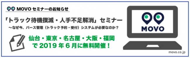 セミナーでは、最新の「バース管理導入、運用における業界動向」や、同社の物流管理ソリューション「MOVO」(ムーボ)導入事例などを紹介するほか、実際の画面を見ながらデモンストレーションを行う。希望者はセミナー終了後に個別相談会にも参加できる。セミナーの参加費は無料で、定員は各都市30人。