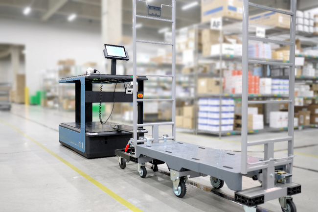 シャープが納入したAGVは、磁気テープであらかじめ設定された軌道上を走行するもので、商品の入出庫時には、AGVに搭載のリーダーでバーコードを読み取ることにより、所定の保管棚や荷積み場所などの目的地をWMSから取得、無人で搬送する。6輪台車を連結することで、最大500キロまでの荷物をけん引する能力がある。