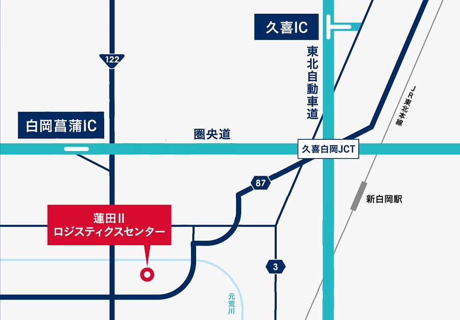 同施設は東北自動車道久喜ICから5キロ、圏央道白岡菖蒲ICから3.6キロと高速道路を利用しやすい立地で、関東から東北まで広いエリアの配送を集約するのに適しており、圏央道を利用することで、交通量の多い都心を経由せずに関東の広域配送が可能。