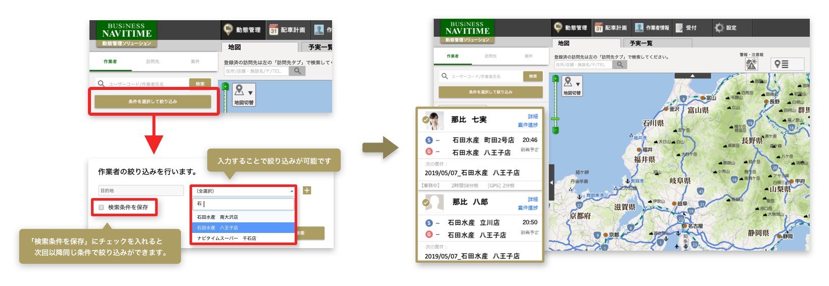 サービス・商品ナビタイムジャパン(東京都港区)は5月31日、法人向け運行管理サービス「ビジネスナビタイム動態管理ソリューション」の管理者・荷主用画面に、特定の配送先へ向かう作業者の絞り込み検索機能を追加した。