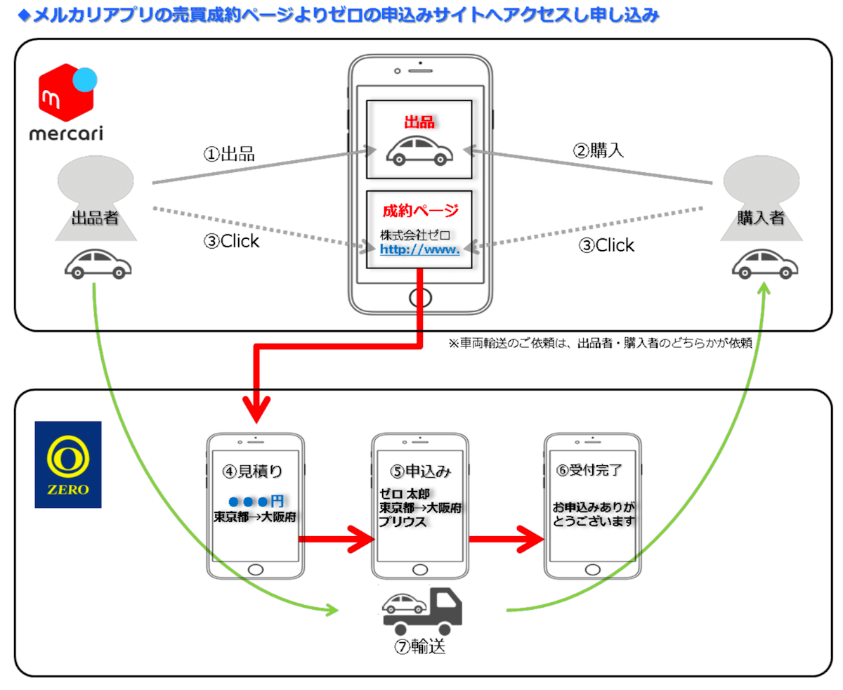 メルカリ利用者は自動車売買の後、ゼロ社の自動車輸送サービス、名義変更サービスを利用することで、輸送予約や受け渡し、名義変更手続きなどの負担・手間を減らせるほか、ゼロがメルカリ利用者向けに用意する特別価格の適用も受けられる。