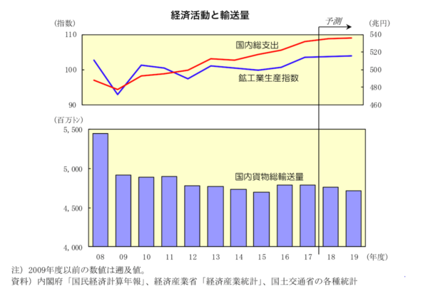 建設関連貨物は、公共投資や住宅投資が小幅ながら増加に転じるものの、輸送量を押し上げるには至らず、マイナス推移が続き、建設関連貨物を除く一般貨物は1.4%の減少となる。