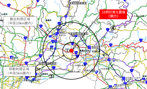 事例の確認に伴い、豚コレラが発生した農場から半径3キロ以内を移動制限区域、10キロ以内を搬出制限区域に設定している。