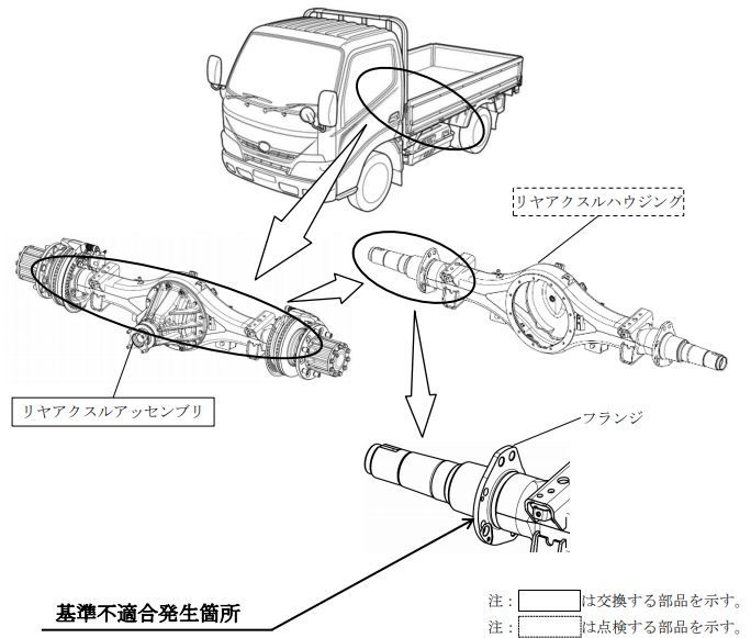 基準不適合状態にあるとされるのは、ブレーキフルードの種類を示すラベルの未貼付とリヤアクスルハウジング部品で、後者は関係部品が損傷することで走行できなくなるおそれがある。