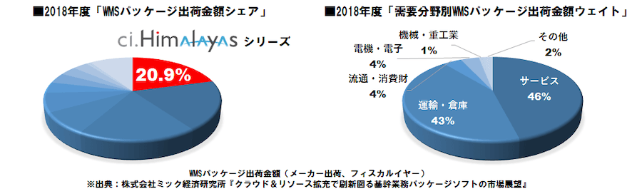 調査はWMSパッケージの「出荷金額」に限定したもので、導入件数や稼働現場数とは異なるものながら、同社の「ci.Himalayas」(シーアイ・ヒマラヤ)シリーズが20.9%のシェアを獲得してトップに輝いた。