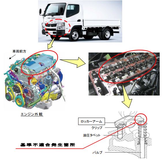 リコールの対象となる車両は2016年(平成28年)8月5日から2018年(平成30年)8月28日までに製作された「ふそうキャンター」「ふそうローザ」「アトラス」「カゼット」の4車種、1万3995台と、修理で当該部品が組み付けられた3車種、480台。対象となる全車両の当該部品を良品に交換するとともに、当該部品に異常摩擦が認められた場合にはシリンダーヘッド一式を交換する。