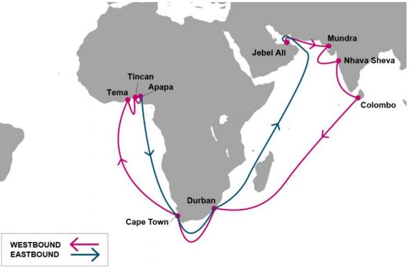 AIMサービスは独ハパックロイドとの合弁会社で提供し、2800TEUのコンテナ船9隻で運航を開始する。寄港先は、ジェベルアリ(UAE)から順にムンドラ(印)、ナバシェバ(同)、コロンボ(スリランカ)、ダーバン(南ア)、ケープタウン(同)、テマ(ガーナ)、ティンカン(ナイジェリア)、アパパ(同)、ケープタウン、ダーバン、ジェベルアリ。