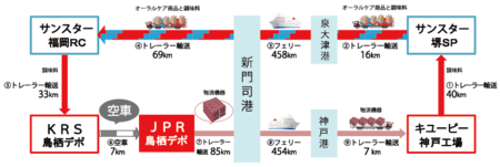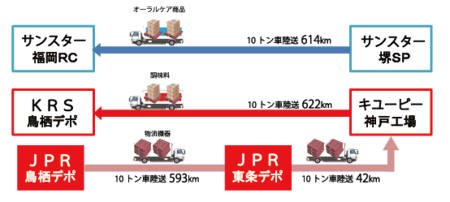また、泉大津港‐新門司港、新門司港‐神戸港のフェリー輸送を用いるなど、3社の物流拠点を効率的に回る輸送ルートを構築。全行程1169キロのうち、空車区間は「KPR鳥栖デポ」と「JPR鳥栖デポ」間のわずか7キロにとどめた。