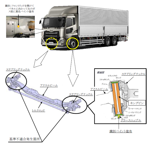 行政・団体UDトラックスは25日、同社の大型トラック「クオン」のかじ取り装置(キングピン)に不具合があるとして、7749台のリコールを国土交通省に届け出た。過度な使用を繰り返すと、タイヤの偏摩耗やハンドル操作に違和感が発生し、最悪の場合、直進安定性が損なわれるおそれがあるという。これまでの不具合報告件数は37件で事故は報告されていない。