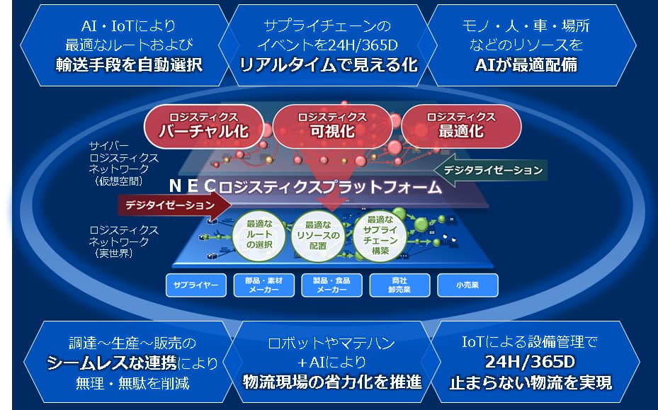 実世界の「モノの流れ」をデータとして収集し、仮想空間で見やすく整えて分析し、その答えを実世界にフィードバックする。例えば最適なルート、輸送手段、モノ・人・クルマ・場所の配置、ムリ・ムダの削減、物流現場の省力化――といった、サプライチェーンにかかわる「目的ごとの最適解」を導き出すための基盤となるのが「NECロジスティクスプラットフォーム」だ。