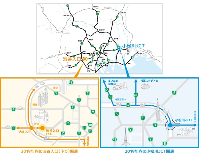 国内首都高速道路は7日、埼玉方面と千葉方面を結ぶ小松川ジャンクション(JCT)と、渋谷線(下り)渋谷入口の工事が進み、年内に開通する見通しになったと発表した。