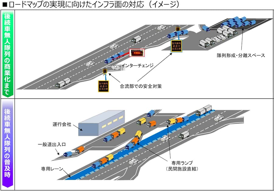 後続車無人隊列走行の商業化までの期間においては既存のSA、PAを拡幅するなどして隊列形成や分離スペースを確保すること、本線への合流時には安全対策として「ランプメータリング」などの合流制御の実証実験を行うこと、隊列の組み方、運営主体の検討――などを進めていく。