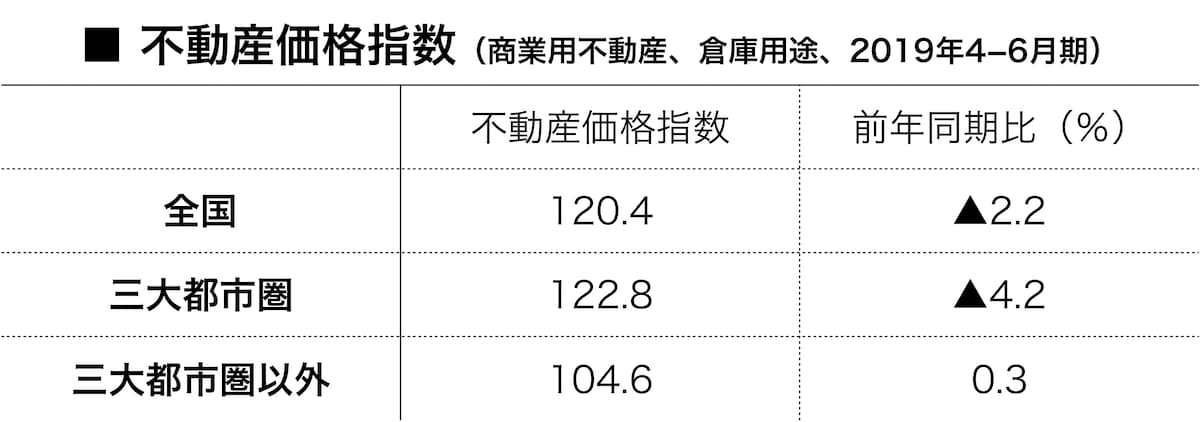 調査・データ国土交通省が28日発表した4−6月期の不動産価格指数によると、商業用不動産のうち倉庫用途として取引された不動産の価格指数は「120.4」と依然として高水準を保ちながらも、18年4−6月期との比較では2.2%下落した。