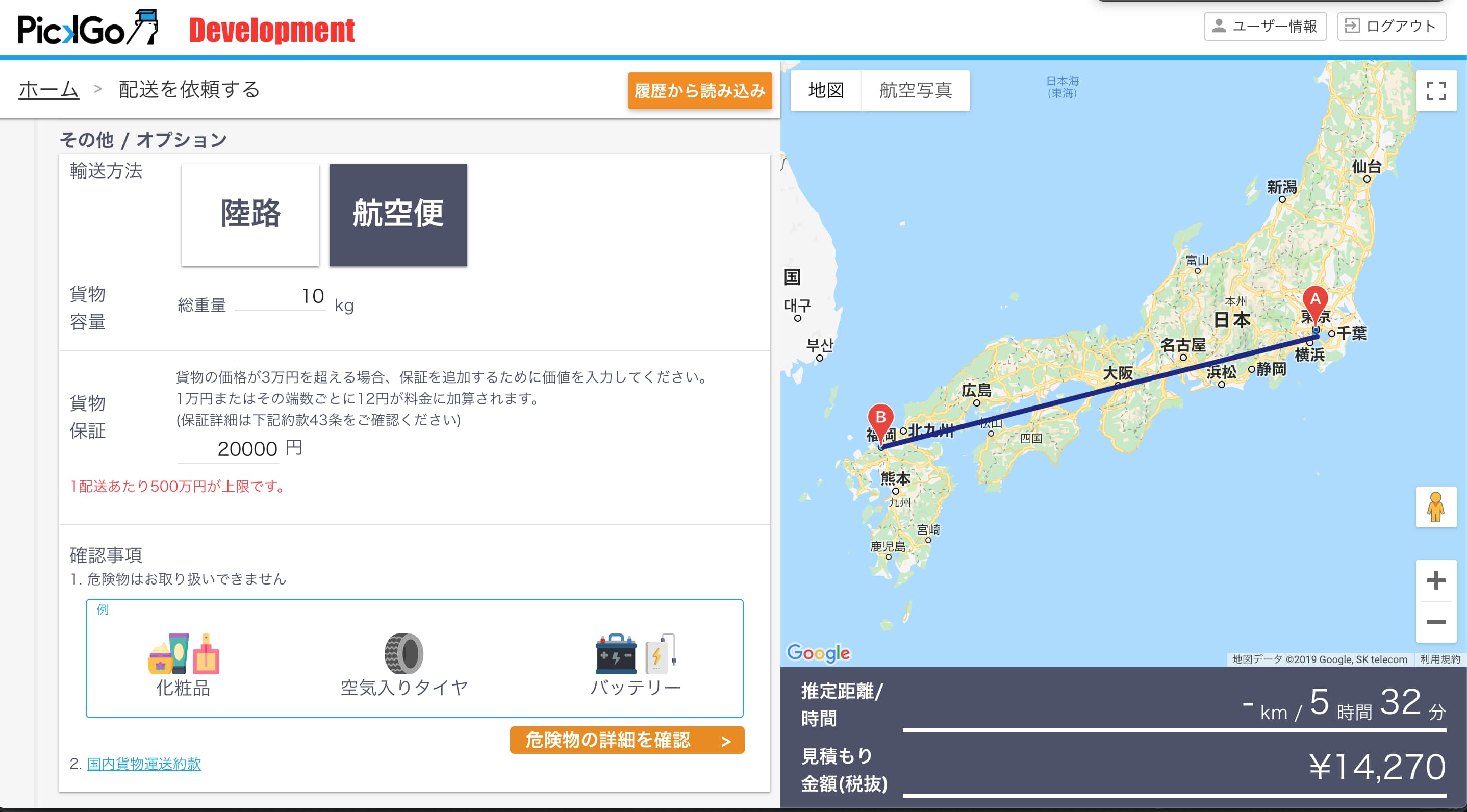 利用希望者はウェブ上で法人会員登録後、ピックゴーに接続し、発送元と輸送先の住所を入力することによって推定距離、所要時間、見積もり金額がサービスサイト上にすぐ提示される。見積もりをもとに、陸路のみの使用や空陸の組み合わせを選択できる。