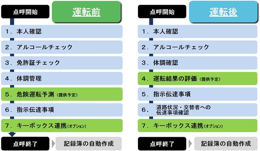 テンコデユニボは、運行管理者が立ち会いのもとでロボットが顔認証によって乗務員本人を確認。アルコールチェッカーや免許証リーダーと連携した点呼業務を行い、点呼記録簿をクラウド上に自動で作成する。オプションのキーボックス連携機能により、運転者が酒気帯びや体調不良と判断された場合は、乗車する車の鍵を「解錠不可」とし危険な運転を未然に防ぐ機能もある。