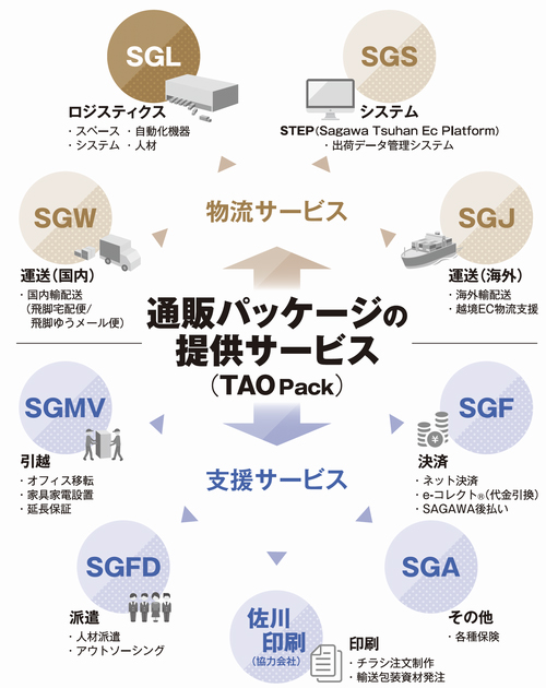 ▲TAOパック(Tsuhan All in One Package)イメージ(SGL:佐川グローバルロジスティクス、SGS:SGシステム、SGW:佐川急便、SGJ:SGHグローバル・ジャパン、SGMV:SGムービング、SGFD:SGフィルダー、SGF:佐川フィナンシャル、SGA:佐川アドバンス)出所:SGホールディングス