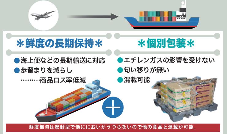 同サービスは、青果物輸送向けに開発した「鮮度保持梱包」を用いることで、個別梱包で密閉状態となるためエチレンガスの影響を受けにくく、海上輸送と倉庫保管で長期間にわたる輸送のなかでも鮮度を保つことができる。また、個別梱包により匂い移りがないことも特徴で、日本酒・鶏卵・チルド加工品に加え、青果物の混載も可能だという。