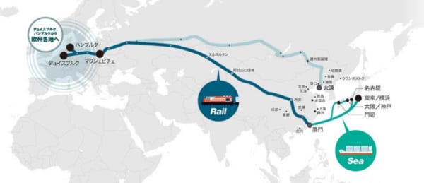 日本の主要港から厦門(アモイ、中国)までを海上輸送しアモイからマワシェビチェ(ポーランド)、ハンブルグとデュイスブルグ(ともにドイツ)間を鉄道輸送する。この組み合わせで欧州へ輸送を行った場合、リードタイムは23-25日となり、すべて海上輸送とした場合の40日よりも短くできる。