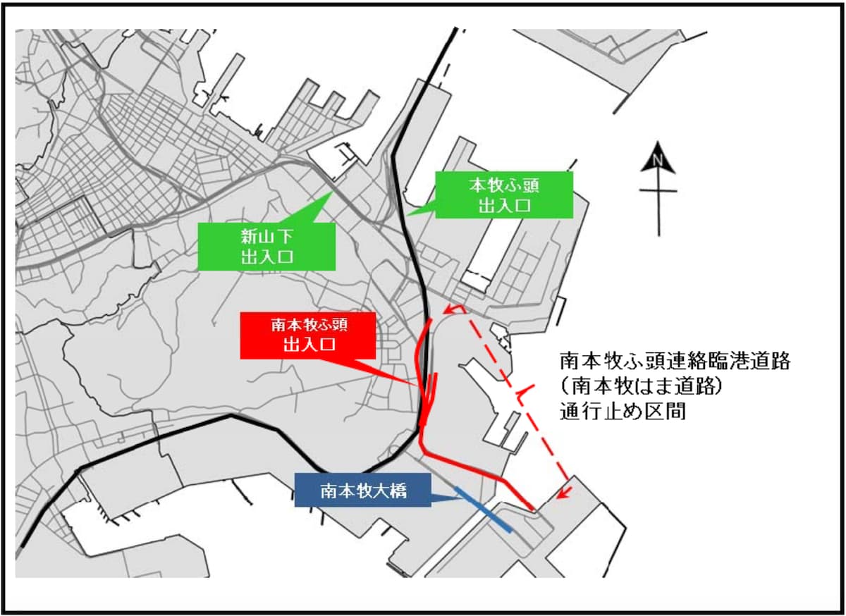 南本牧はま道路は、首都圏を縦断した台風15号の暴風で貨物船が接触し、大きな被害が生じた。通行止めに伴い、首都高速湾岸線の南本牧ふ頭出入口も利用できなくなっているが、湾岸線大黒ふ頭方面へ向かう場合は本牧ふ頭出入口、狩場方面は新山下出入口を利用できる。