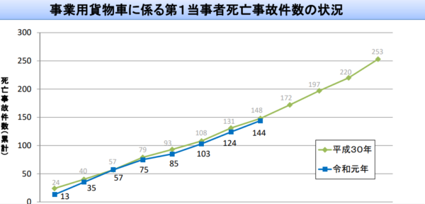 内訳は、大型トラックが12件(増減なし)、中型が3件(2件減)、準中型4件(4件増)、普通1件(1件増)で、1月から8月までの累計死亡事故件数は144件(4件減)だった。