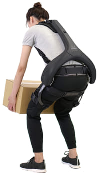 「アトウン モデル Y」は腰の負担を軽減する着用型ロボットで、最大10キロの重量をアシストする。床面付近から腰の高さ程度までの物の持ち上げや下に降ろす際に内蔵する角度センサーが体の傾きを感知し、モーターによって腰と両脚をつなぐバーが引き合ったり、突っ張ったりすることで腰の曲げ伸ばしを補助する。また中腰の作業では、バーが自動で固定されるため、荷物の積み下ろし作業による腰への負担が軽減できるもので、関西空港での貨物荷捌き業務などでも導入されている。