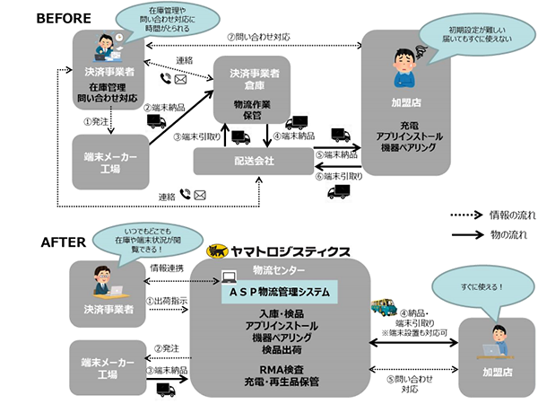 同サービスは、メーカーから納品された決済端末の入庫・検品・在庫管理など物流業務のほか、端末の初期設定・インストール・充電・動作確認などの設置補助や、解約・故障時の交換回収といったアフターサービスまでを事業者に代わって請け負うもので、事業者はこれらの作業を一括して同社に委託することで経営資源を本業に集中させることができる。