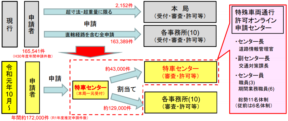 ロジスティクス関東地方整備局は27日、新たに「特殊車両通行許可オンライン申請センター」(特車センター)を設置し、10月1日から申請の提出先を同センターに統一すると発表した。