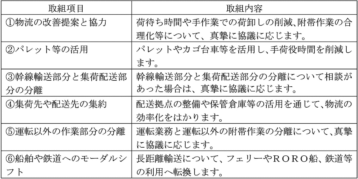 発注量の平準化に向けた取り組みでは、荷待ち時間の短縮と併せ、月ごとの波動などの繁閑差の平準化を進め、運行効率を高めていく。荷役作業時の安全対策としては、労働災害の発生防止を目的に安全な作業手順の明示、安全通路の確保、足場の設置などの対策に努める、とした。